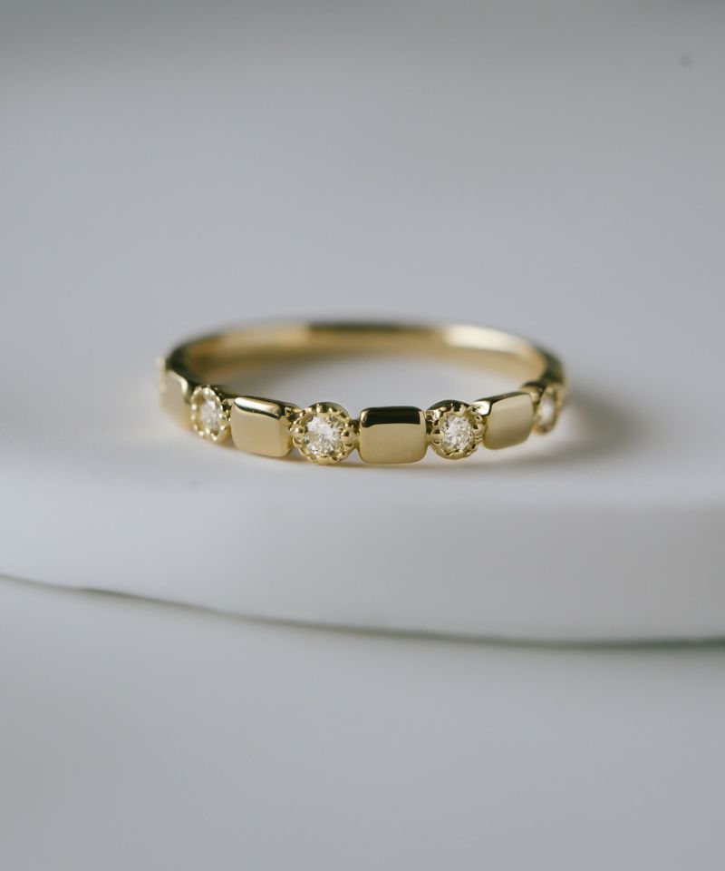ラウンドとスクエアのモチーフが交互に並ぶリズミカルなデザインは、控えめでありながら指元に上品な存在感を添えてくれる。