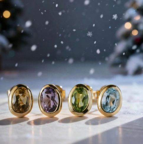 上品で爽やかなグリーンのペリドット [8月の誕生石]、澄み渡る青空のようなスカイブルートパーズ [11月の誕生石]、暖かな陽だまりのようなシトリン [11月の誕生石]、高貴でミステリアスなアメジスト [2月の誕生石]で構成されている。