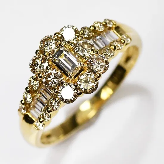 ラウンドブリリアントカットのみならずバゲットカットのダイヤモンドを中央に配し、18金を惜しげなく使用した地金とともにその輝きは豪華絢爛である。