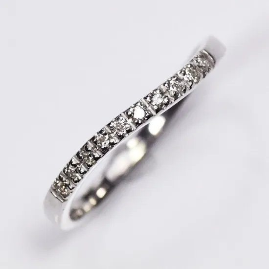 ウェーブのかかった上品なデザインのリングの前面に透明度が高くテリ(輝き)の強い天然ダイヤモンドを敷き詰めたダイヤモンドリングである。