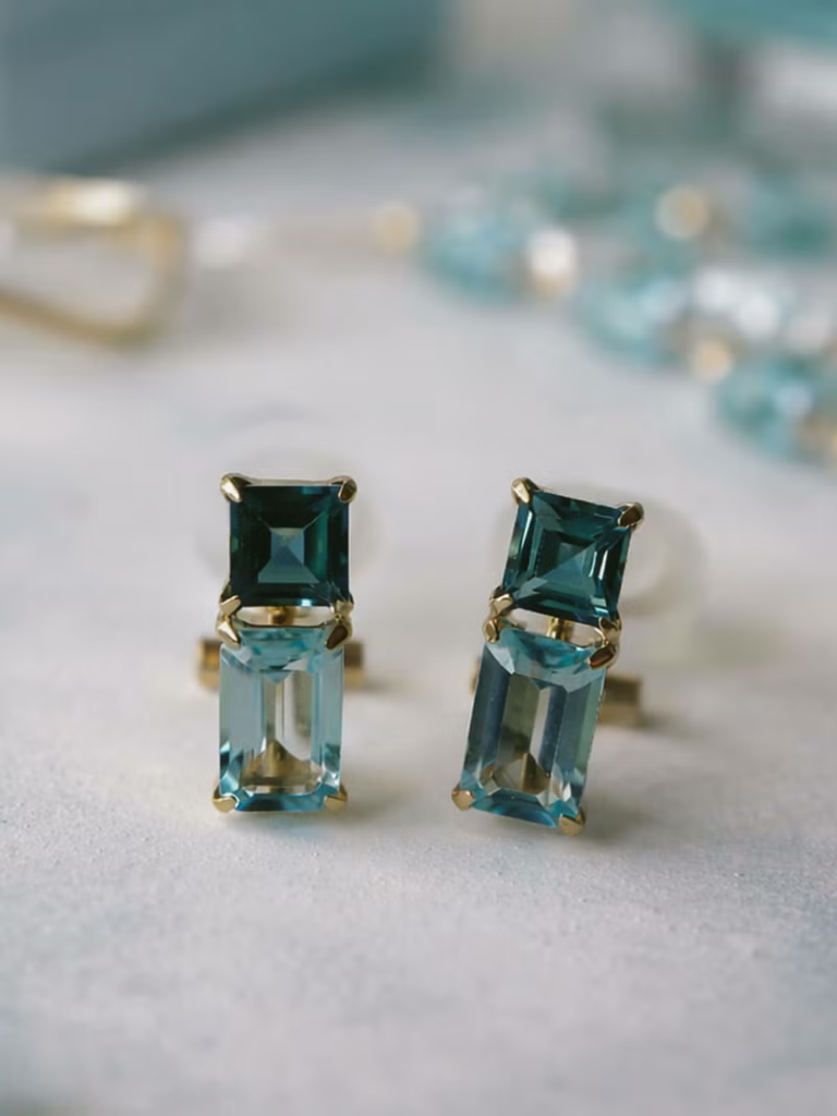 上下に配したブルートパーズが縦のラインを描き、すっとした印象をつくるK10のイヤリング。